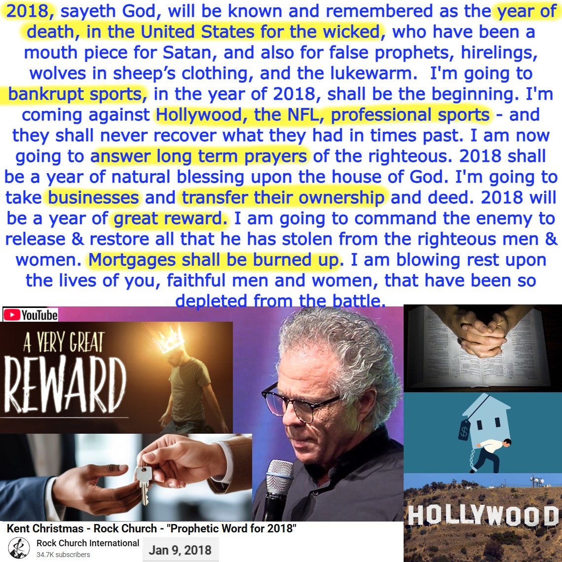 God coming against Hollywood, NFL, professional sports. Many churches removed. Business ownership transferred. Year of death of the wicked in USA and Great Reward. Mortgages burned up. Rest coming. 2018 Prophecy by Kent Christmas on 1/9/2018. See my summary, partial transcript, and video link below: