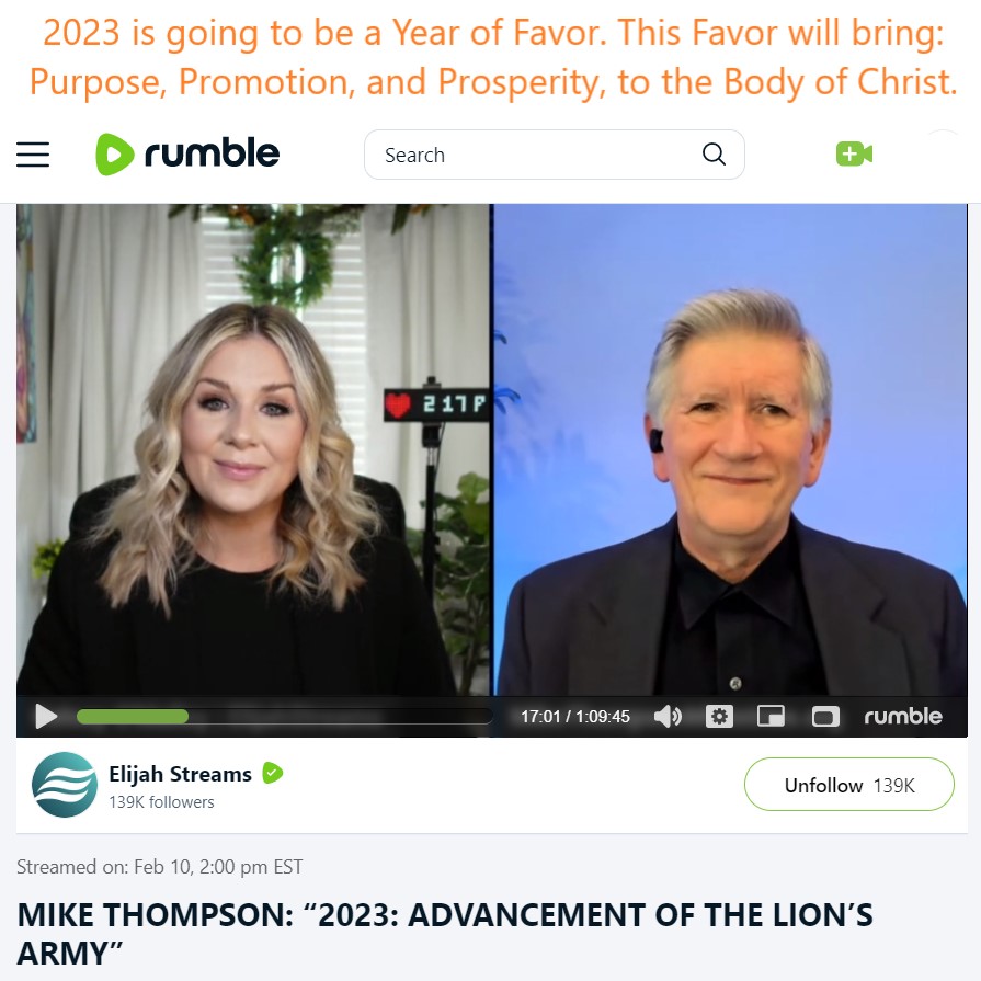 On 2/10/23 Mike Thompson shared a new prophecy. 2023 is going to be a Year of Favor. This Favor will bring: Purpose, Promotion, and Prosperity, to the Body of Christ. Please see video link and partial transcript below: