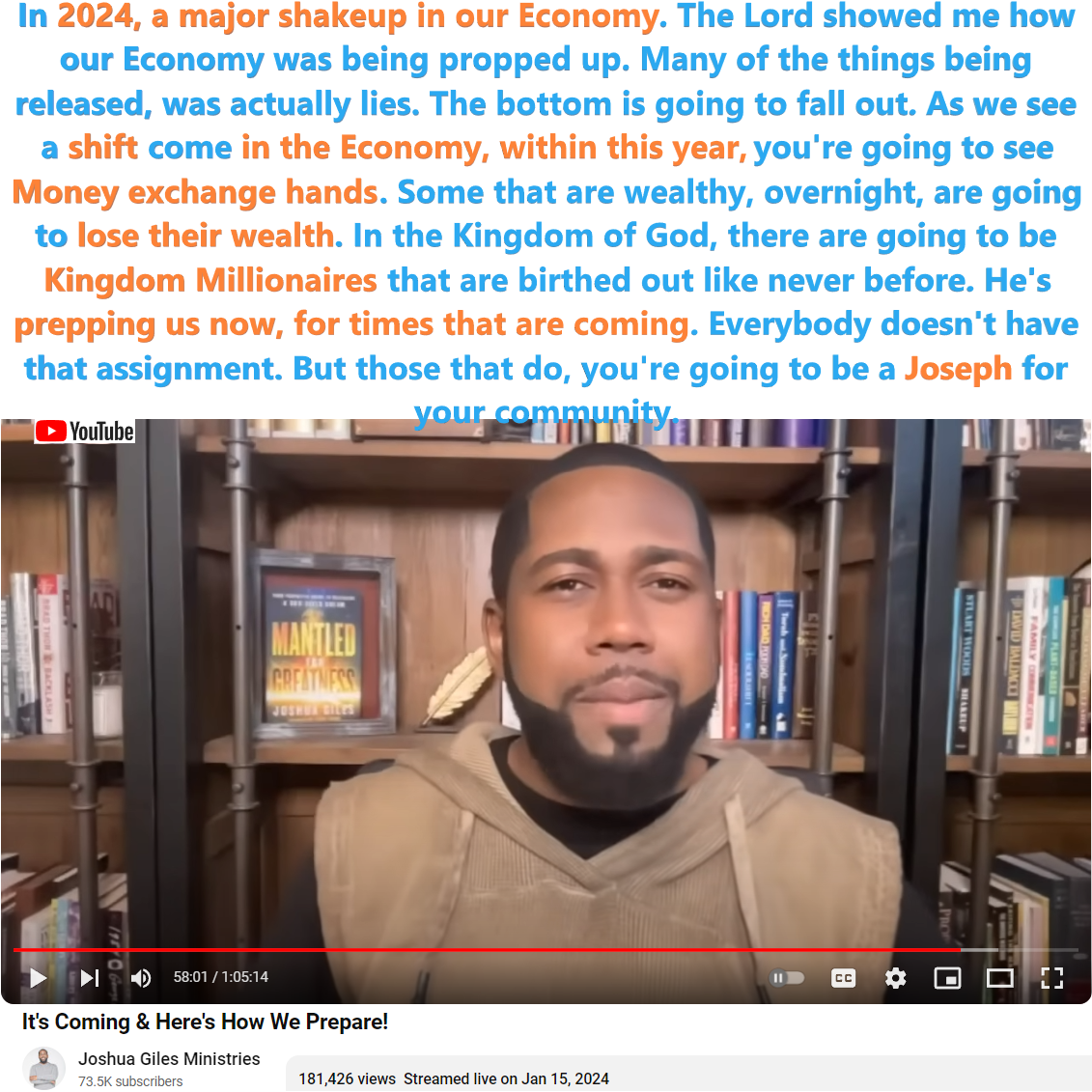 2024 Wealth Transfer Prophecy by Joshua Giles released on 1/15/24. See partial transcript and video link below: