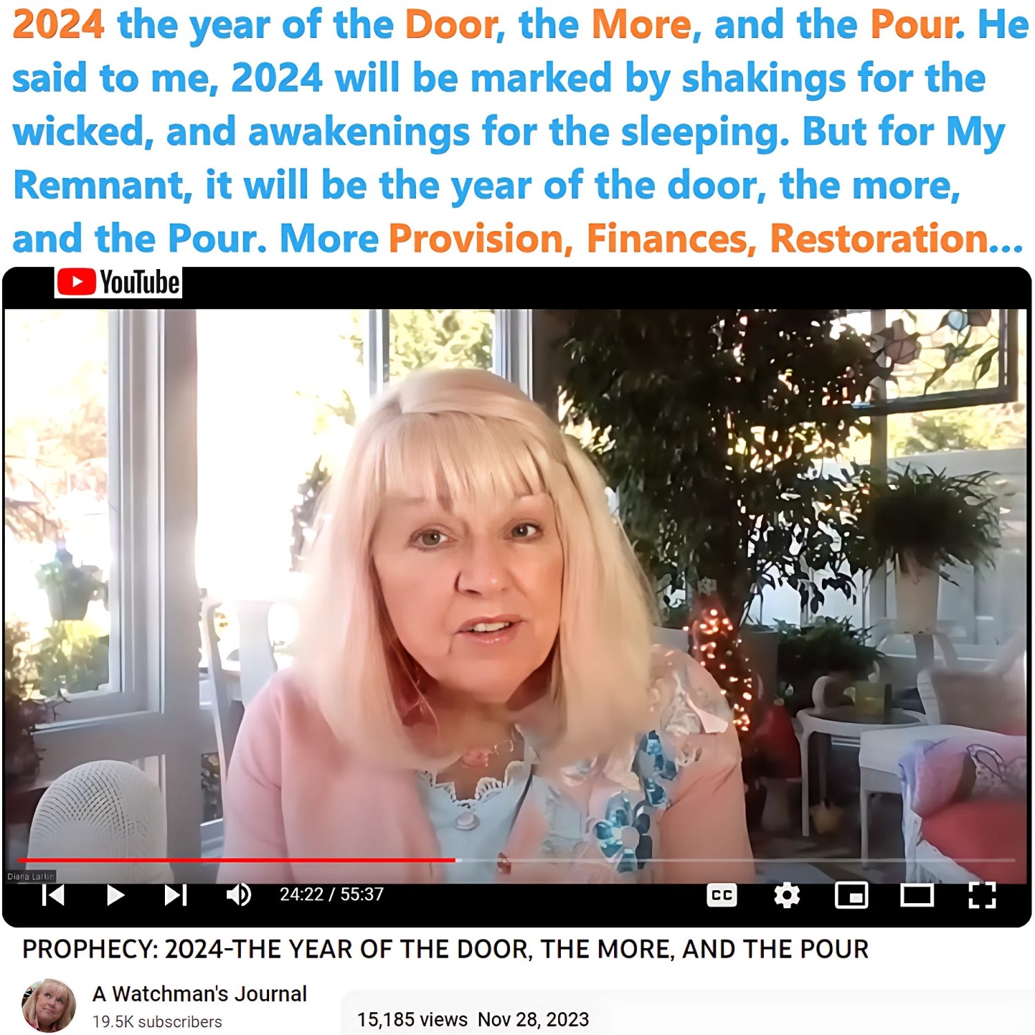 The video transcript “PROPHECY: 2024-THE YEAR OF THE DOOR, THE MORE, AND THE POUR” contains prophetic words, journal entries, spiritual instructions, and observations of signs and wonders shared by Diana Lin. The stated assignment for this season is to encourage and strengthen God’s people during an unprecedented time.