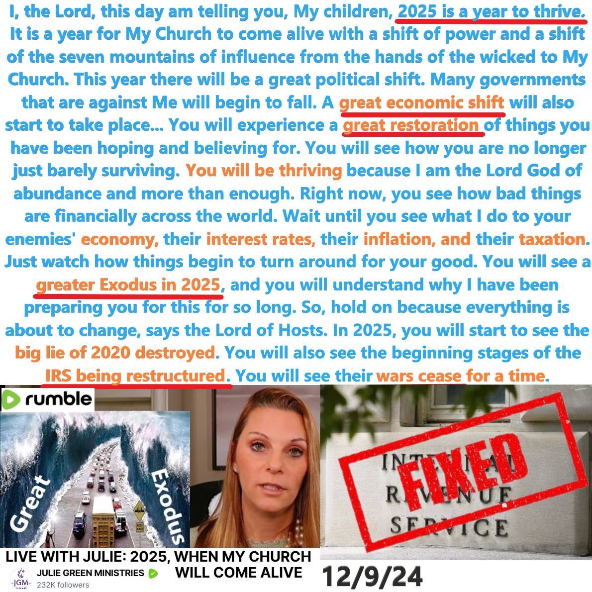 I, the Lord, this day am telling you, My children, 2025 is a year to thrive. It is a year for My Church to come alive with a shift of power and a shift of the seven mountains of influence from the hands of the wicked to My Church. This year there will be a great political shift. Many governments that are against Me will begin to fall. A great economic shift will also start to take place because this is the hour when I will completely destroy your enemies’ source of power against you. You will experience a great restoration of things you have been hoping and believing for. You will see how you are no longer just barely surviving. You will be thriving because I am the Lord God of abundance and more than enough. Right now, you see how bad things are financially across the world. Wait until you see what I do to your enemies’ economy, their interest rates, their inflation, and their taxation. Just watch how things begin to turn around for your good. You will see a greater Exodus in 2025, and you will understand why I have been preparing you for this for so long. So, hold on because everything is about to change, says the Lord of Hosts. In 2025, you will start to see the big lie of 2020 destroyed. You will also see the beginning stages of the IRS being restructured. You will see their wars cease for a time.