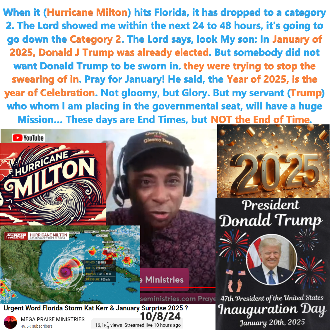 Hurricane Milton will drop to Category 2 within the next 24 to 48 hours. Vision: in January of 2025, Donald J Trump was already elected. But they were trying to stop the swearing of in. Pray for January!.. The year of 2025, is the year of Celebration. Not gloomy, but Glory. these days are end times, but not the end of time. there’s still yet much to do. and he says, you are experiencing birth pains. My Harvest doors are opening, and My Glory will spread all over my Earth. I will heal My Church. Prophecy on 10/8/24 by Manuel Johnson. See partial transcript and video link below: