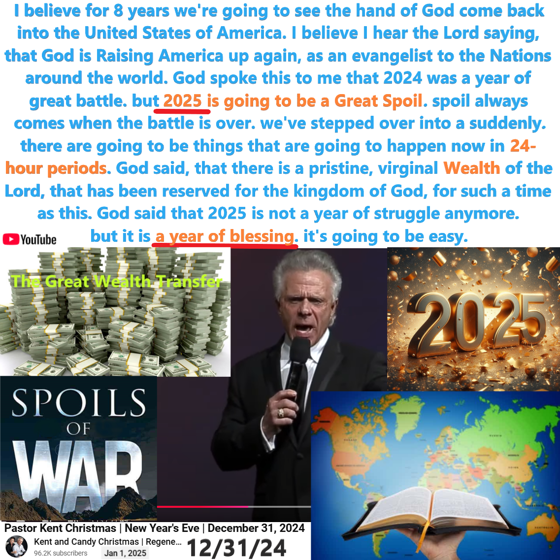 2025 – a Year of Blessing and Great Spoil. Prophecy by Kent Christmas on 12/31/24. See my summary, partial transcript, and video link below: