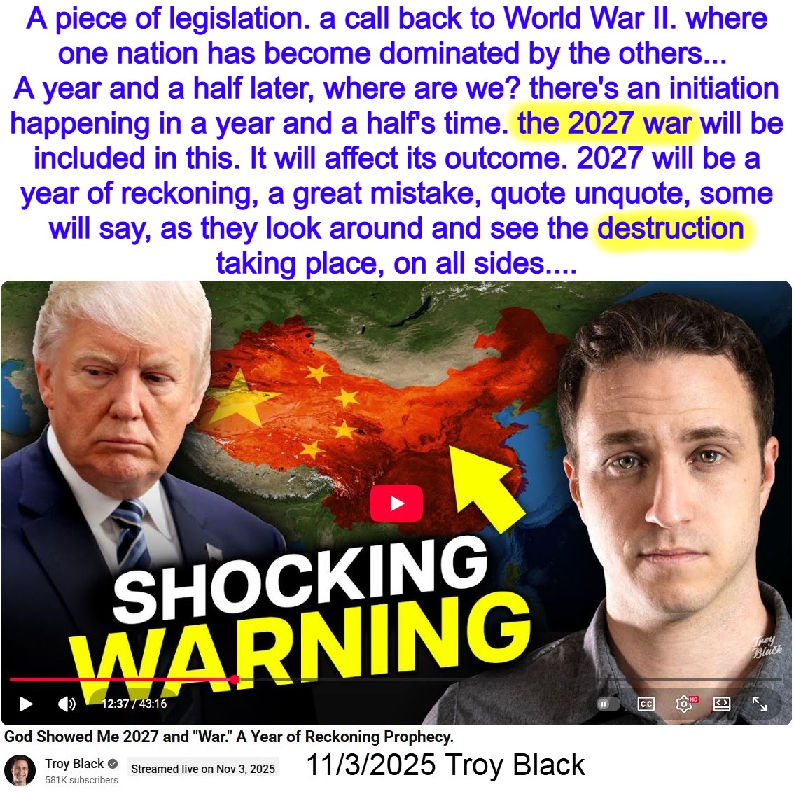 War in 2027. Prophecy by Troy Black on 11/3/25. See partial transcript, AI Summary, and video link below:
