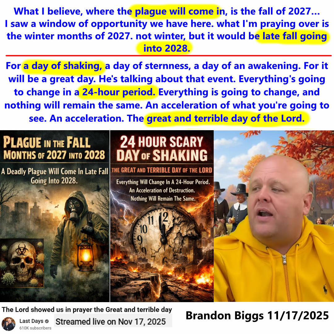 Plague will come in Fall/Winter Months of 2027 into 2028. Great and Terrible Day of the Lord (after Tribulation). Prophecy by Brandon Biggs on 11/28/2025. See partial transcript, ai summary, and video link below: