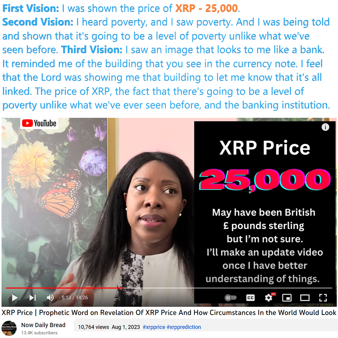 On 8/1/23 Sharon from Now Daily Bread shared a vision, where she saw the price of XRP, Poverty, and Banking Institution. See partial transcript and video link below: