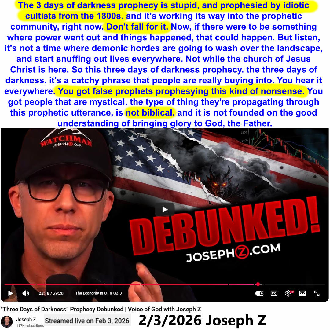 The 3 days of darkness prophecy is stupid, and prophesied by idiotic cultists from the 1800s. Don’t fall for it. You got false prophets prophesying this kind of nonsense. Teaching by Joseph Z on 2/3/2026. See partial transcript, ai summary, and video link below:
