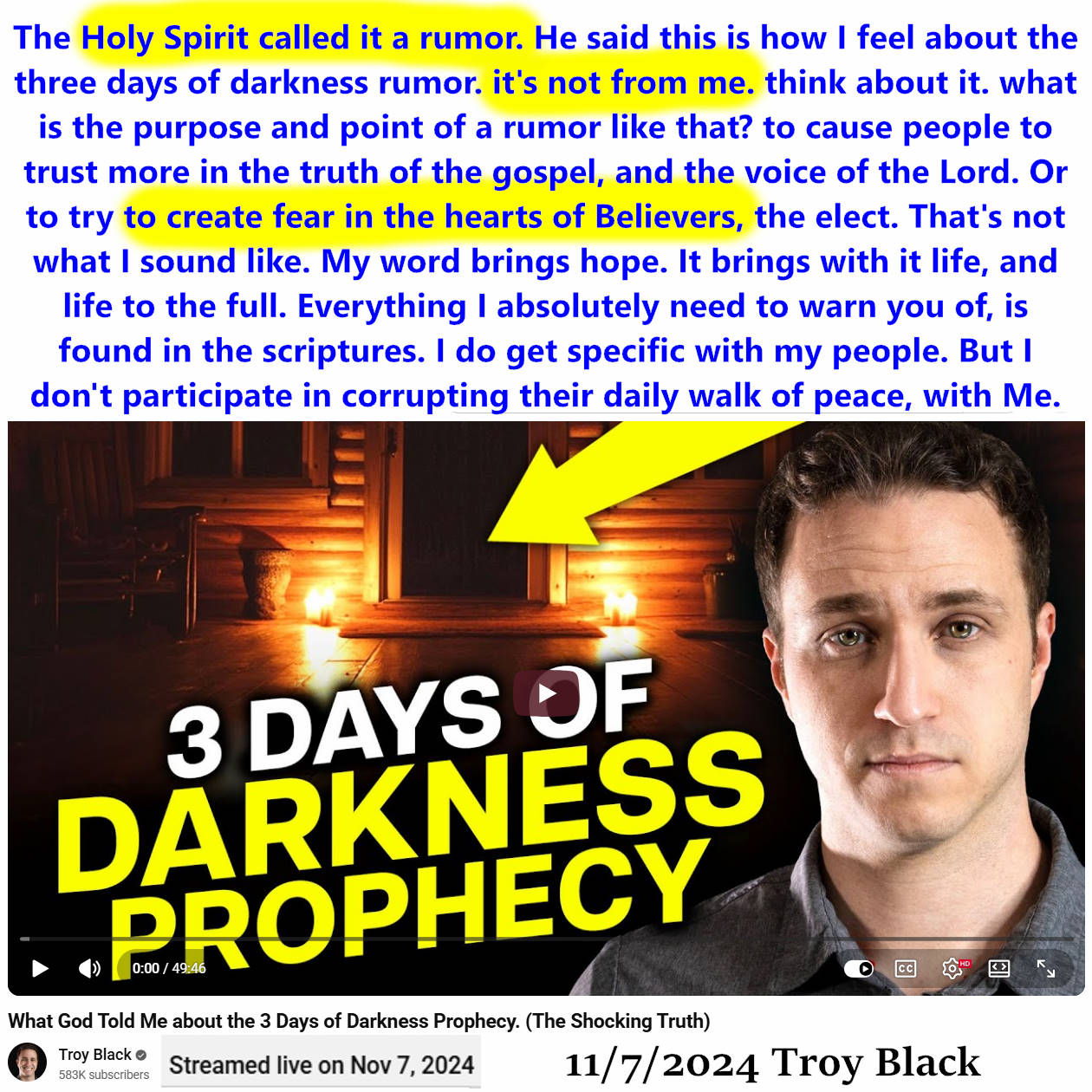 3 Days of Darkness – Holy Spirit called it a rumor. He said, it’s not from Me. Purpose of the rumor is try to create fear in the hearts of Believers. Prophecy by Troy Black on 11/7/2024. See partial transcript, ai summary, and video link below: