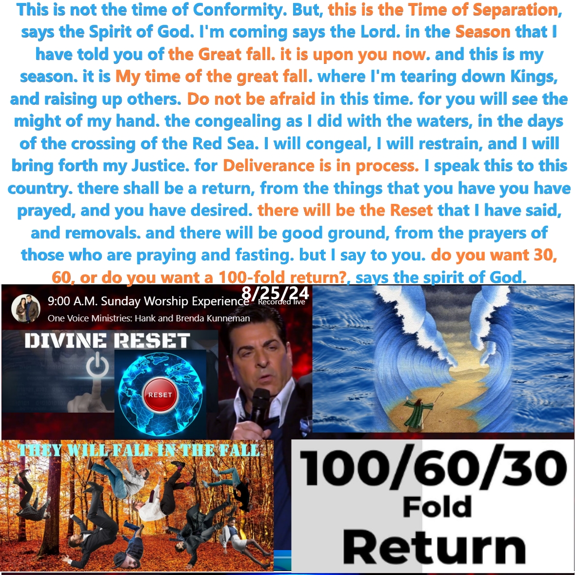 30, 60, 100 Fold Return. Great Fall is upon you now. There will be a Reset. Deliverance is in process. Prophecy by Hank Kunneman on 8/25/24. See partial transcript and video link below: