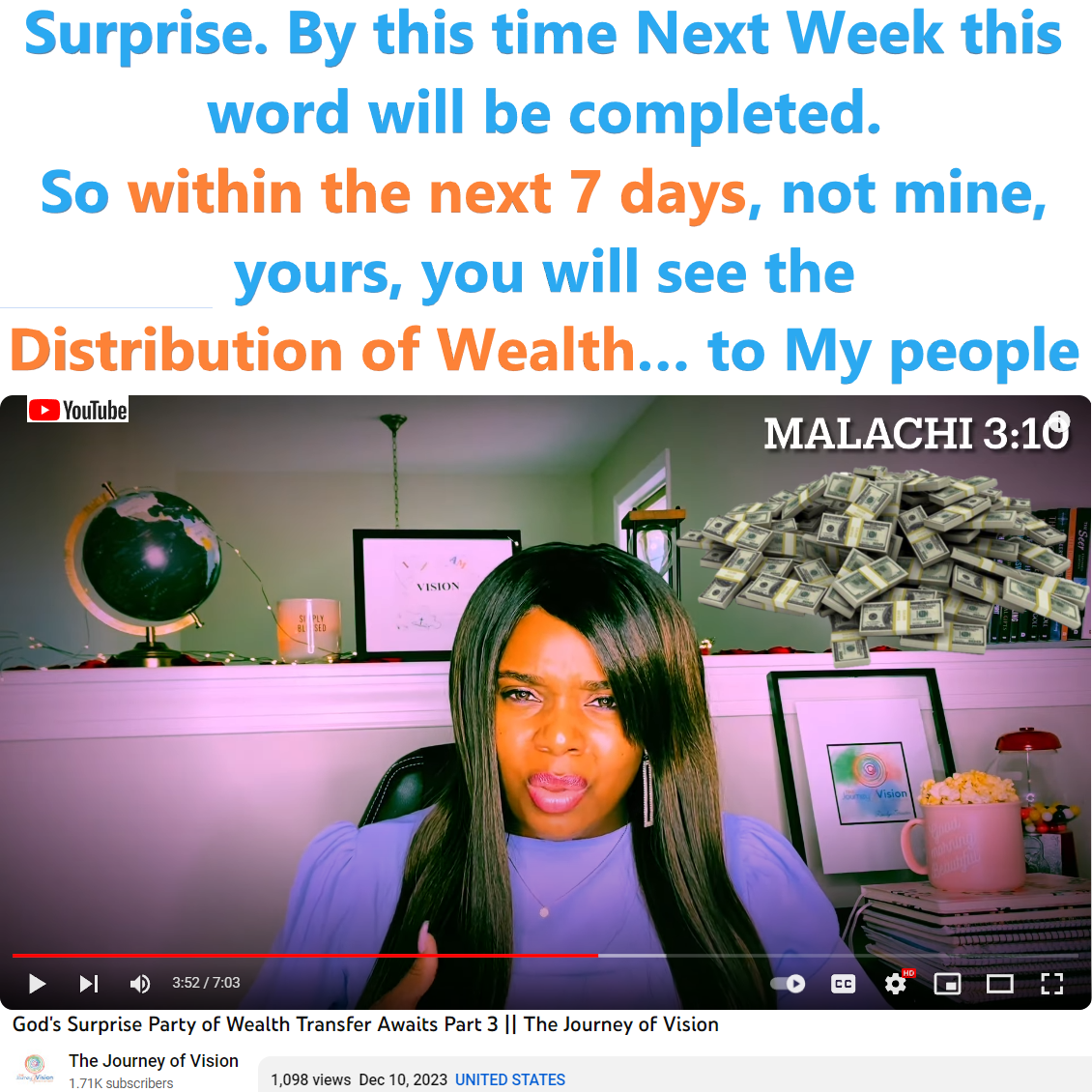Rosalyn Streeter (The Journey of Vision) shared a prophetic word on 12/10/23 regarding the Wealth Transfer timeline. As always according to 1 John 4, please use Discernment and Test the Spirits. Please see partial transcript and video link below: