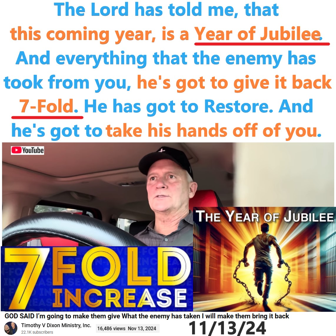 Year of Jubilee and 7-Fold Restoration. Prophecy by Timothy Dixon on 11/13/24. See partial transcript and video link below: