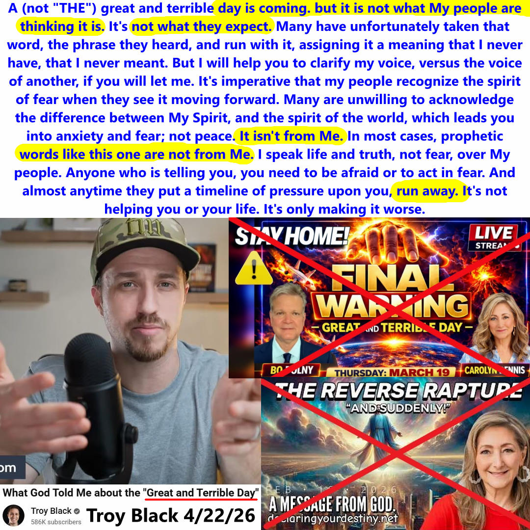 A (not “THE”) great and terrible day is coming. but it is not what My people are thinking it is or expect. It isn’t from Me. Prophecy by Troy Black on 4/22/26. See my summary, partial transcript, ai summary, and video link below: