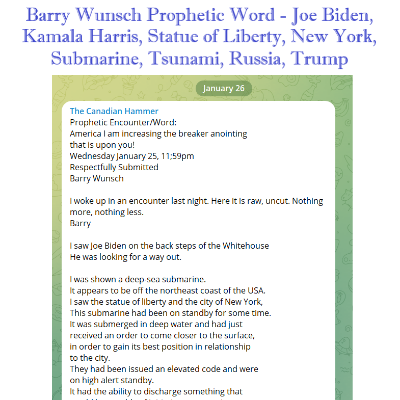 Barry Wunsch has released a new Prophetic word regarding Joe Biden, Kamala Harris, Statue of Liberty, New York, Submarine, Tsunami, Russia, Trump. I saw Joe Biden surrounded by a team of officials/investigators and was cornered and forced to step down. Charges were pending. I saw a TV with Kamala being sworn in to Presidential office. Please see his Telegram post below.