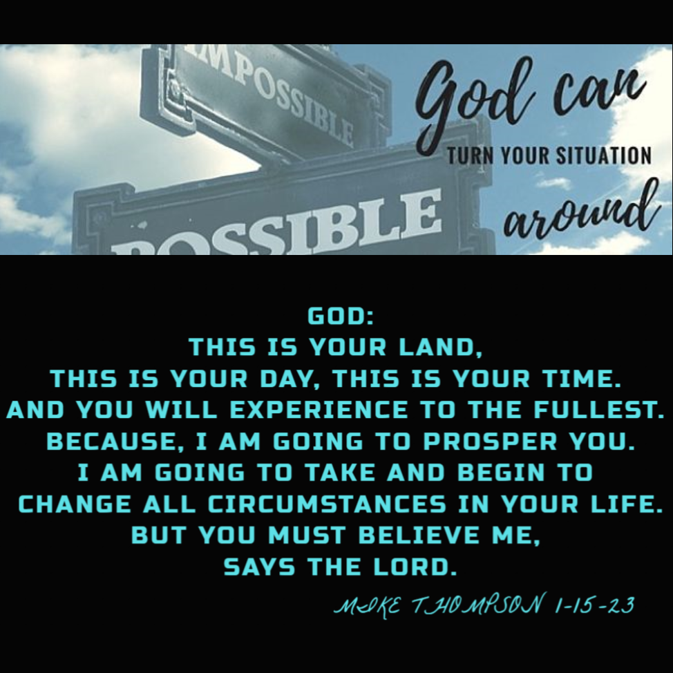 God: This is your Land, this is your Day, this is your Time. And you will experience to the fullest. Because, I am going to Prosper you. I am going to take and begin to change all circumstances in your life. But you must believe Me, says the Lord. (Mike Thompson 1-15-23)