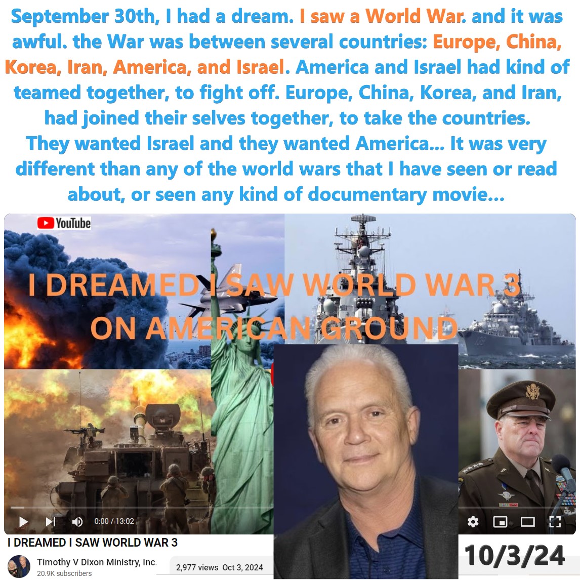 World War between Europe, China, Korea, Iran, America, and Israel. Prophecy by Timothy Dixon on 10/3/24. See partial transcript and video link below: