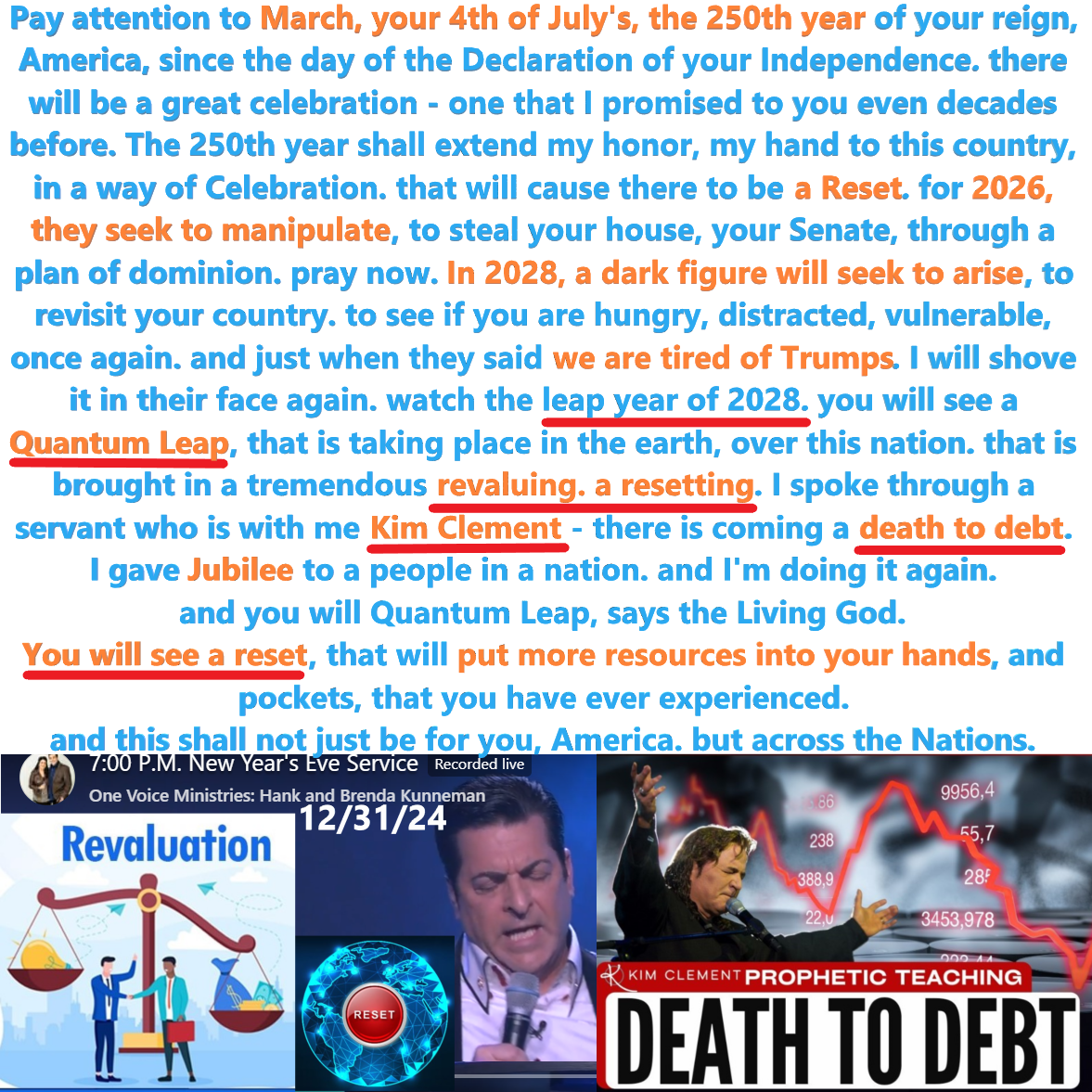 Pay attention to March, your 4th of July’s, the 250th year of your reign, America, since the day of the Declaration of your Independence. there will be a great celebration – one that I promised to you even decades before. The 250th year shall extend my honor, my hand to this country, in a way of Celebration. that will cause there to be a Reset. for 2026, they seek to manipulate, to steal your house, your Senate, through a plan of dominion. pray now. In 2028, a dark figure will seek to arise, to revisit your country. to see if you are hungry, distracted, vulnerable, once again. and just when they said we are tired of Trumps. I will shove it in their face again. watch the leap year of 2028. you will see a Quantum Leap, that is taking place in the earth, over this nation. that is brought in a tremendous revaluing. a resetting. I spoke through a servant who is with me Kim Clement – there is coming a death to debt. I gave Jubilee to a people in a nation. and I’m doing it again. and you will Quantum Leap, says the Living God. You will see a reset, that will put more resources into your hands, and pockets, that you have ever experienced. and this shall not just be for you, America. but across the Nations.