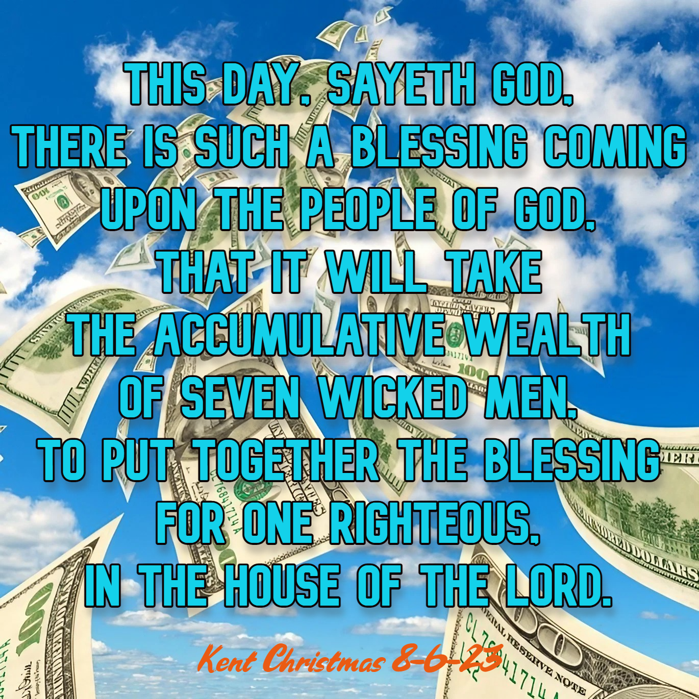 This day, sayeth God, there is such a Blessing coming upon the People of God, that it will take the Accumulative Wealth of seven wicked men, to put together the Blessing for one Righteous, in the House of the Lord. (Kent Christmas 8-6-23)