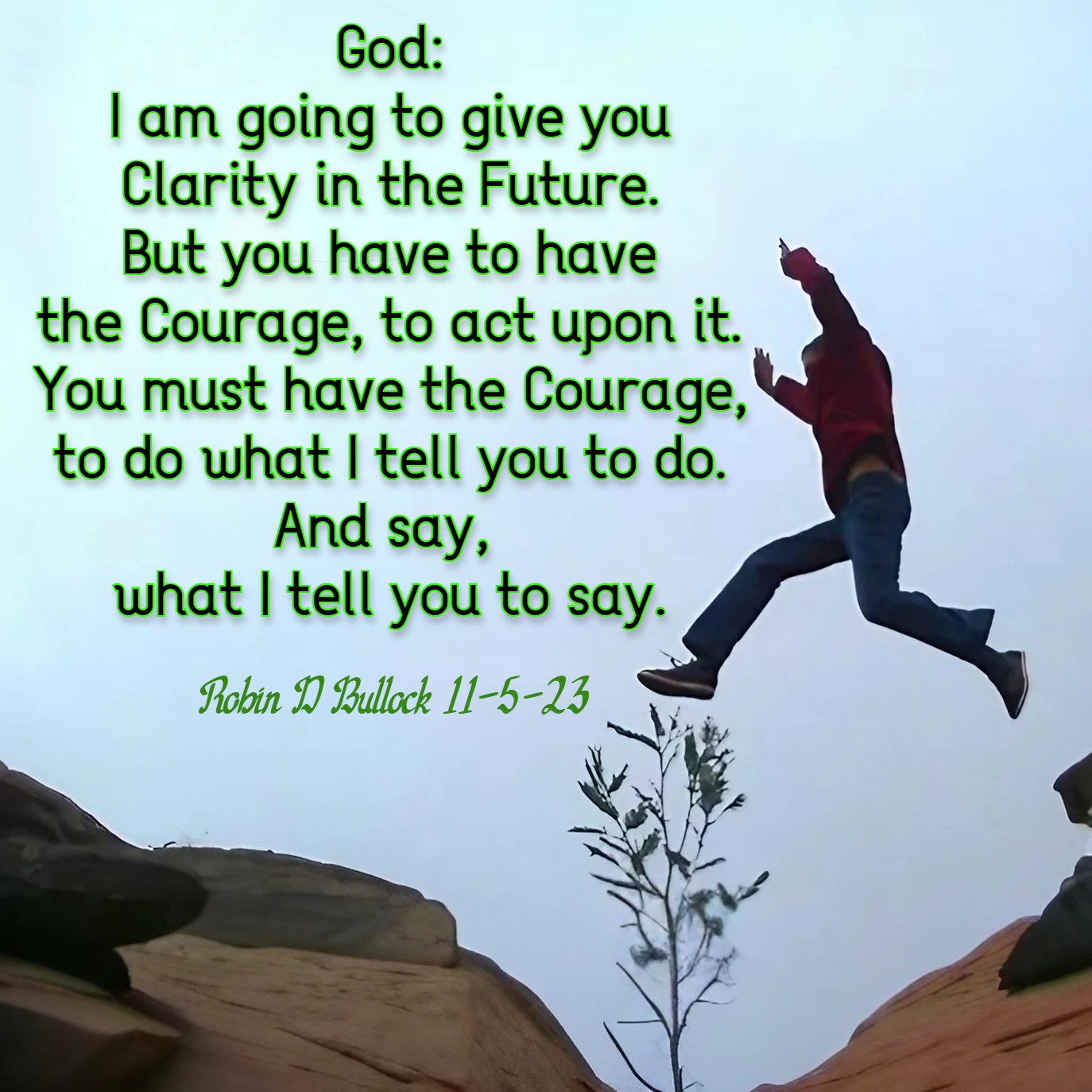 God: I am going to give you Clarity in the Future. But you have to have the Courage, to act upon it. You must have the Courage, to do what I tell you to do. And say, what I tell you to say. (Robin D Bullock 11-5-23)