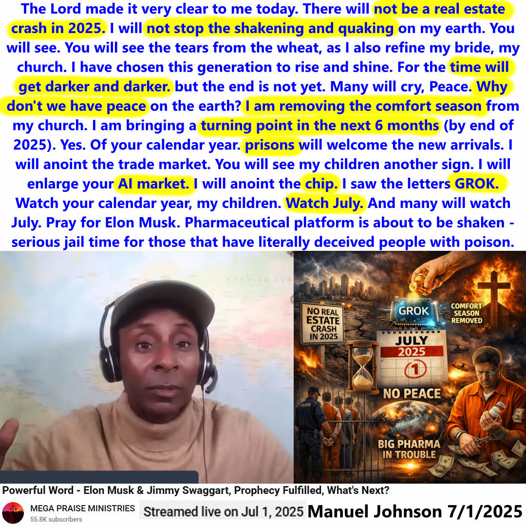 No Real Estate Crash in 2025. AI Market, GROK AI Chip, No Peace on Earth, Comfort Season Removed from Church. Prophecy by Manuel Johnson on 7/1/2025. See partial transcript, ai summary, and video link below:
