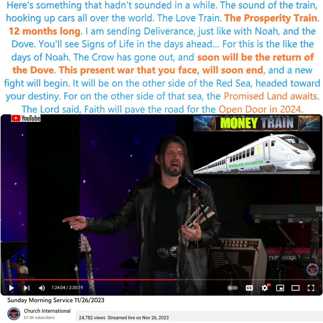 1:27:00 – Here’s something that hadn’t sounded in a while. The sound of the train, hooking up cars all over the world. And men’s lives will never be the same. There’ll be a road through Gaza. A road, a highway of sorts. Soon reals and videos that are posted, will have to be longer than shorts. The Love Train. The Prosperity train. 12 months long. Be listening for a new prophetic song.
