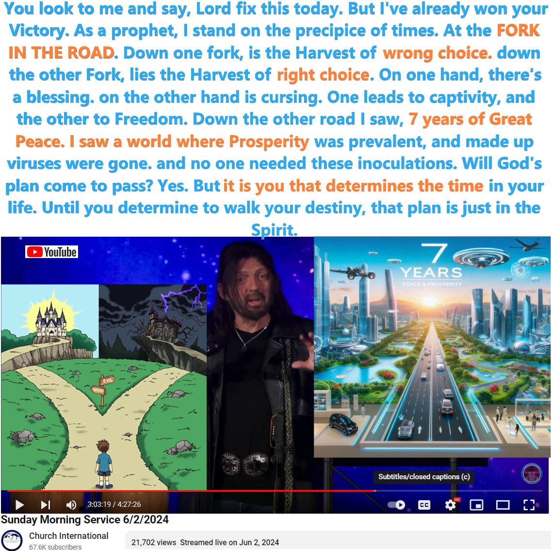 2:40:20 – as the prophet spoke, the crowd grew quiet. the prophet then raises his voice, and points at the other Road. I’ve also been down that road. down that road I saw, seven years of great peace. I saw a world where men and women’s faces do not look distorted. I saw a world where confusion of gender was gone. I saw, said the prophet, a world, where children were playing in the streets, because they had been allowed to be born. I saw a world where Prosperity was prevalent, and made up viruses were gone. and no one needed these inoculations. I saw a world where people could afford to buy groceries. I saw a world where hope once against can be seen, once again.