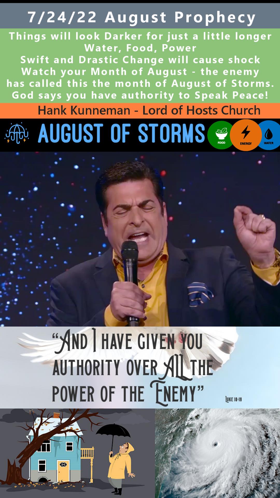 Watch this prophecy by Pastor Hank Kunneman on July 24, 2022, where the Spirit of the Lord has called for His watchmen and intercessors to stand in the gap to pray against storms in the month of August and for a divine delay to disrupt the plans of the enemy concerning the mid-term elections.