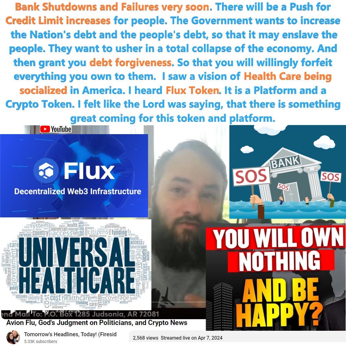 FLUX Crypto, Bank Shutdowns/Failures coming soon. Credit Limit Increases. Avian Flu. Socialized Healthcare. Prophecy by Robyn Cunningham on 4/7/24. See partial transcript and video link below: