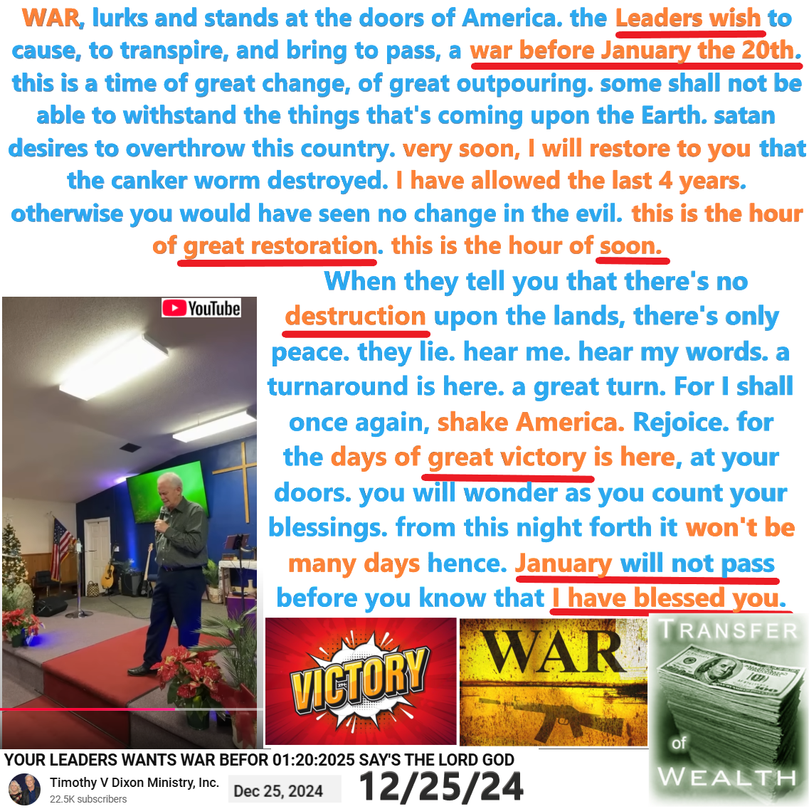 The leaders, wish to cause a war before January the 20th. January will not pass before you know that I have blessed you. Prophecy by Timothy Dixon on 12/25/24. See partial transcript and video link below: