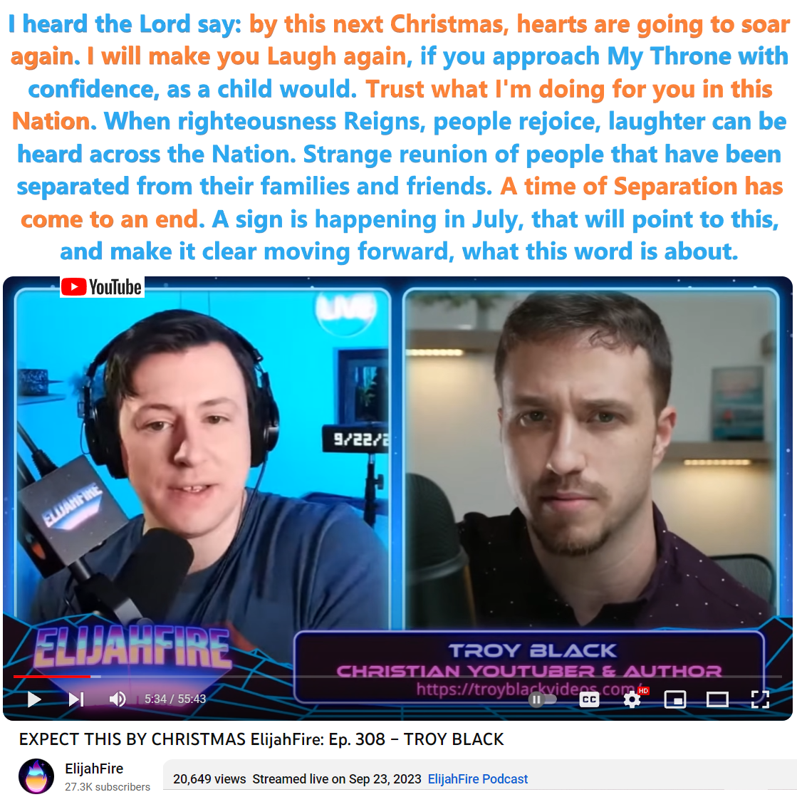 On 9/23/23 Troy Black shared a prophetic word about the coming Christmas time. See partial transcript and video link below: