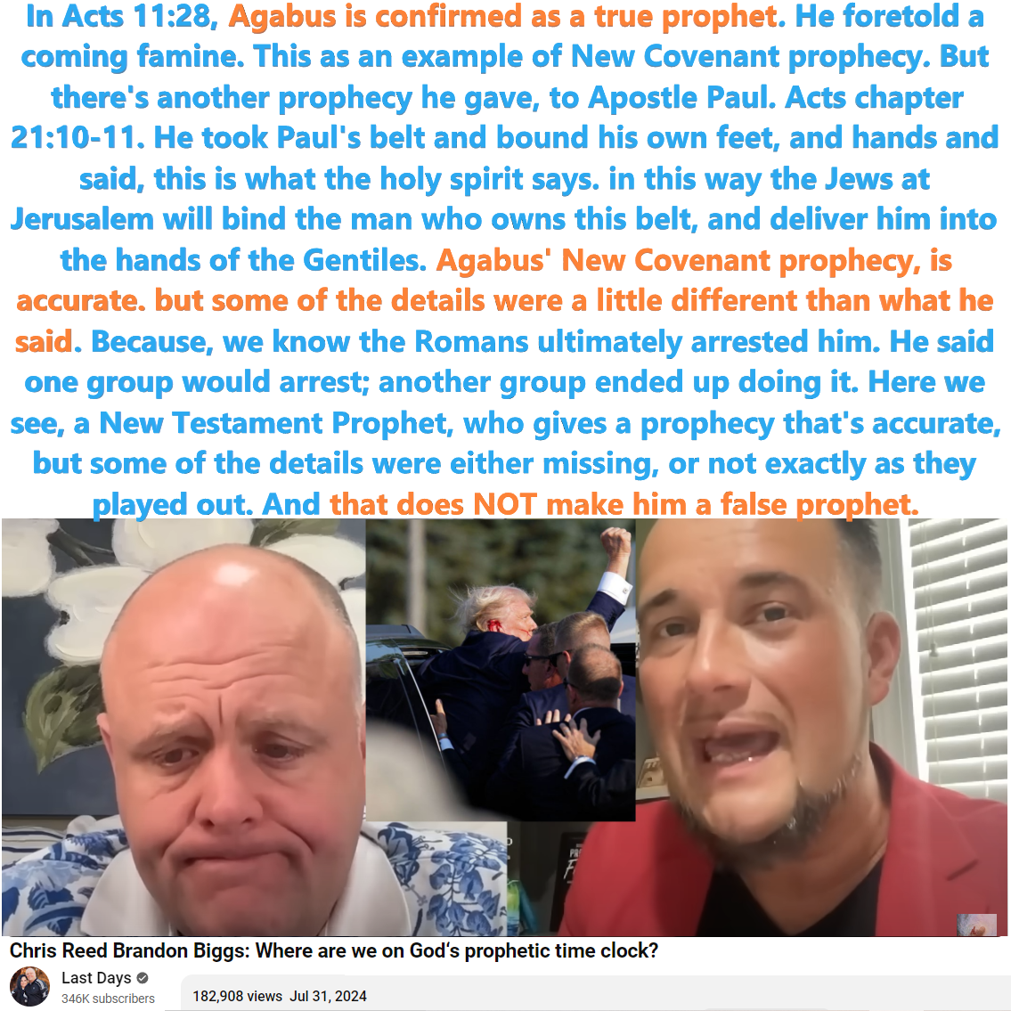 5:00 – Chris: but there’s another prophecy he gave. one is international. the other one was a personal prophetic word. and that is he gave that prophetic word to the Apostle Paul. and I just want to read it to you, Acts chapter 21:10-11. as we were staying there, in cesaria Philippi, for some days, a prophet named agabus came down from Judea. And coming to us, he took Paul’s belt and bound his own feet, and hands and said, this is what the holy spirit says. in this way the Jews at Jerusalem will bind the man who owns this belt, and deliver him into the hands of the Gentiles. So, the overall gist of Agabus’ New Covenant prophecy, is accurate. but the truth is, some of the details were a little different than what he said. does that make him a false prophet? absolutely not! because the Bible, the infallible inspired word of God, calls him a prophet. but there were some of the details about who would arrest him, and how that would happen, were a little bit different than the details that he gave. Because, we know the Romans ultimately arrested him. And I think that’s important. And so he said one group would arrest, another group ended up doing it. so this puts those who don’t believe in the gifts of the Spirit, in a real bad spot. because here we see, a New Covenant Prophet, a new testament Prophet, who gives a prophecy that’s accurate, but some of the details were either missing, or not exactly as they played out. and that does NOT make him a false prophet.