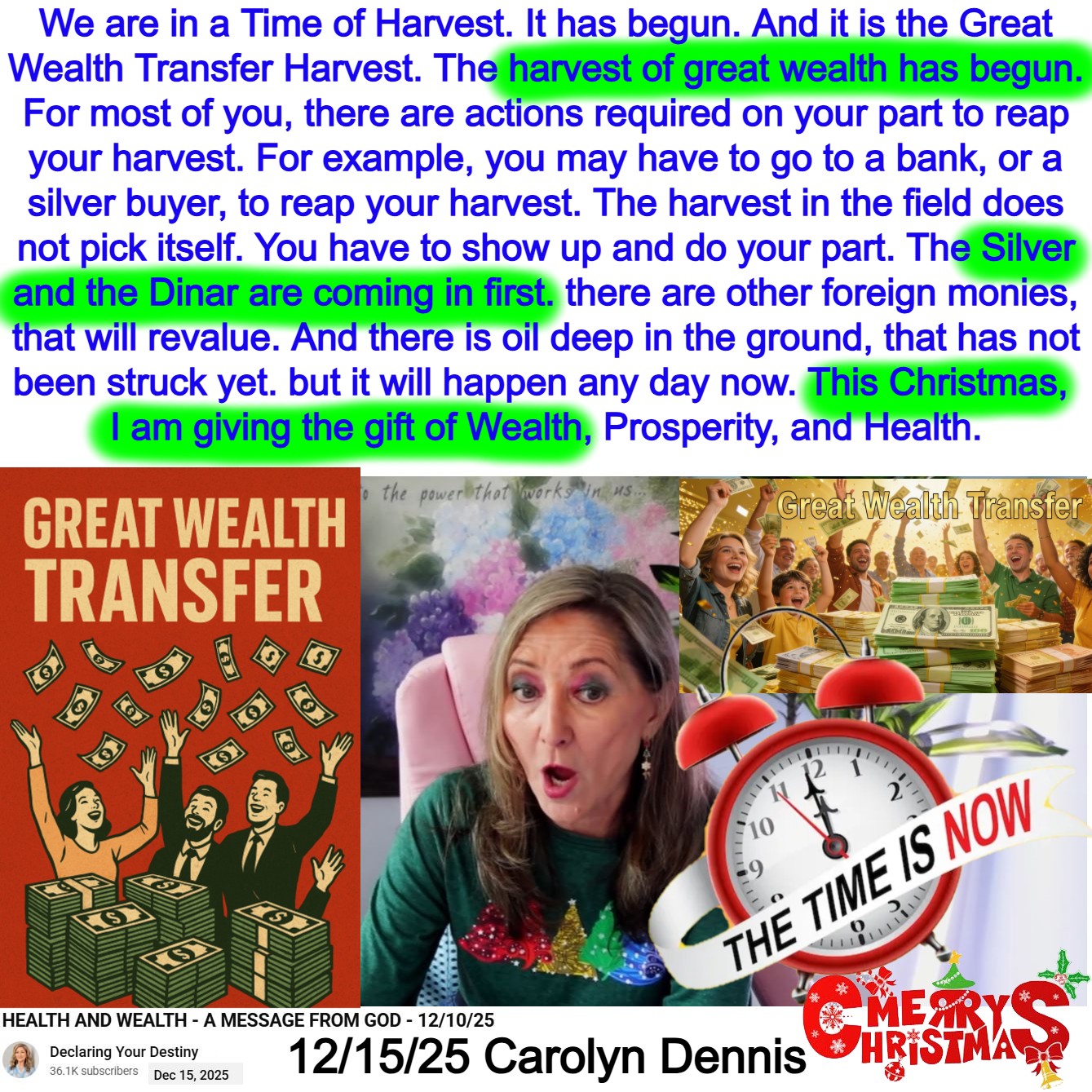 This Christmas, I am giving the Gift of Wealth, Prosperity, and Health. Silver and Dinar are coming in first. Foreign monies revalue. Oil – any day now. Prophecy by Carolyn Dennis on 12/15/25. See partial transcript, AI Summary, and video link below: