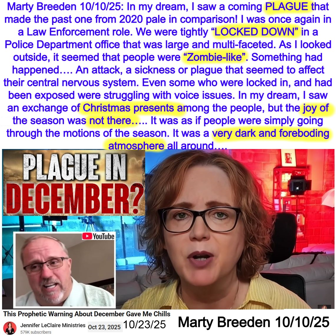 Dark atmosphere during Christmas. Plague. Locked Down. Zombie-like. Jennifer Leclaire shares Marty Breeden’s 10/10/25 Prophetic Dream. See partial transcript and video link below: