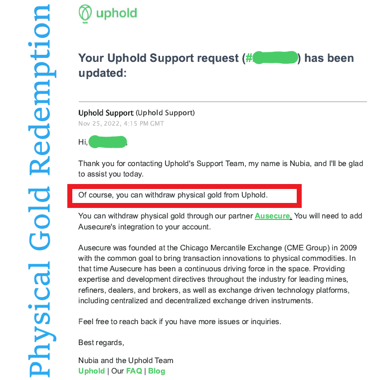 I went ahead and emailed Uphold support, to confirm this physical redemption is still ongoing today. And Uphold confirmed, that it still does work today.