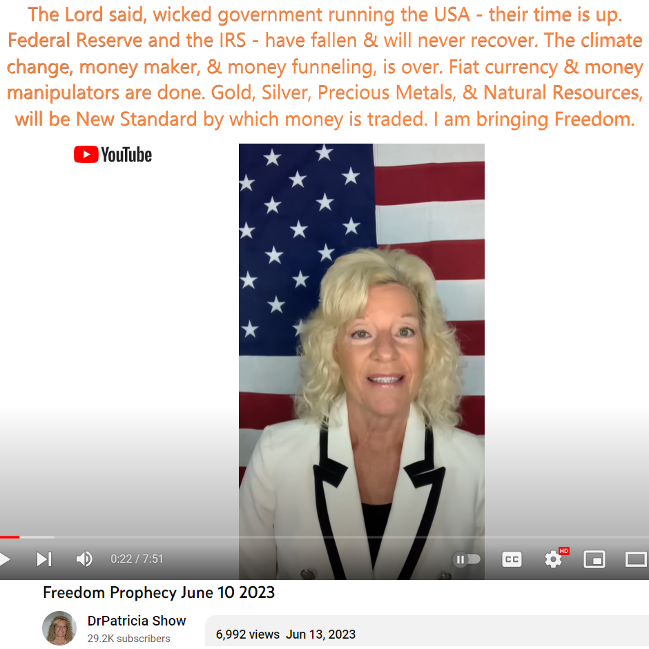 On 6/13/23 Dr Patricia Show-Green shared a new Prophetic Word regarding Wealth Transfer, Elections, Gold & Silver, Dollar fiat currency, Federal Reserve & IRS and prayers/declarations. Please see video link and partial transcript below: