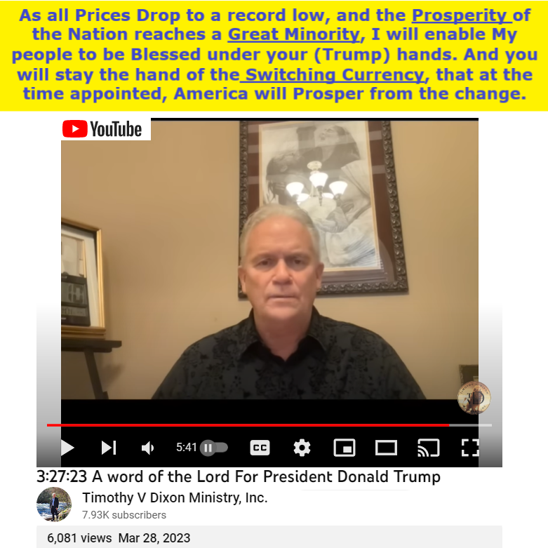 On 3/27/23 Timothy Dixon (@timothyvdixonministryinc ) shared a new Prophetic word regarding Donald Trump, Poverty in America, and Switching Currency. Please see video link, and partial transcript below.