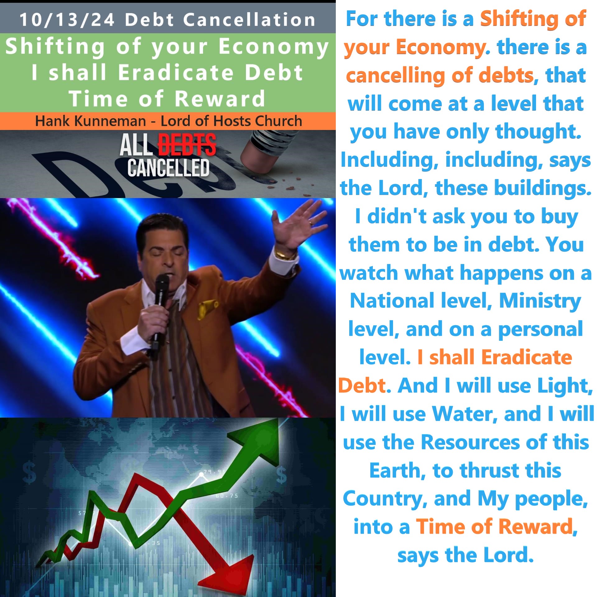 For there is a shifting of your economy. There is a cancelling of debts, that will come at a level that you have only thought. Including, including, says the Lord, these buildings. I didn’t ask you to buy them to be in debt. You watch what happens on a National level, Ministry level, and on a personal level. I shall eradicate debt. And I will use light, I will use water, and I will use the resources of this Earth, to thrust this country, and My people, into a time of Reward, says the Lord. (Hank Kunneman 10–13–24)