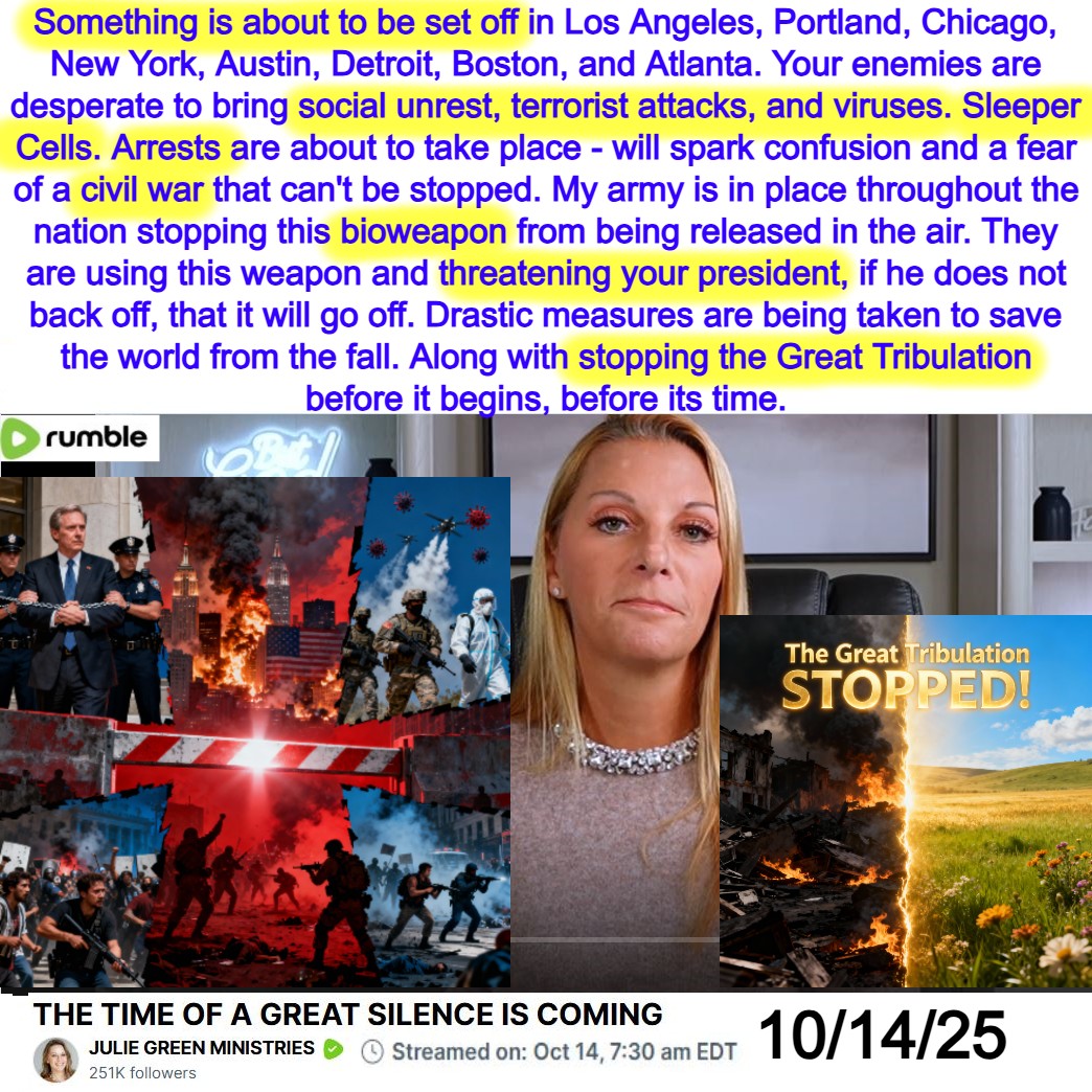 Angel of Death, Arrests, Civil War, Sleeper Cells, Bioweapon, President Threatened to back off, Great Tribulation STOPPED. Prophecy by Julie Green on 10/14/25. See partial transcript and video link below.