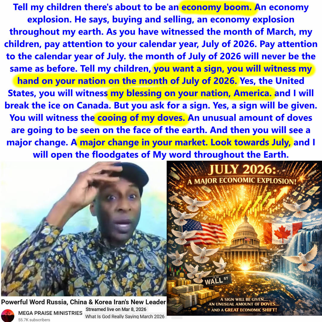 Tell my children there’s about to be an economy boom. An economy explosion. He says, buying and selling, an economy explosion throughout my earth. As you have witnessed the month of March, my children, pay attention to your calendar year, July of 2026. Pay attention to the calendar year of July. the month of July of 2026 will never be the same as before. Tell my children, you want a sign, you will witness my hand on your nation on the month of July of 2026. Yes, the United States, you will witness my blessing on your nation, America. and I will break the ice on Canada. But you ask for a sign. Yes, a sign will be given. You will witness the cooing of my doves. An unusual amount of doves are going to be seen on the face of the earth. And then you will see a major change. A major change in your market. Look towards July, and I will open the floodgates of My word throughout the Earth.