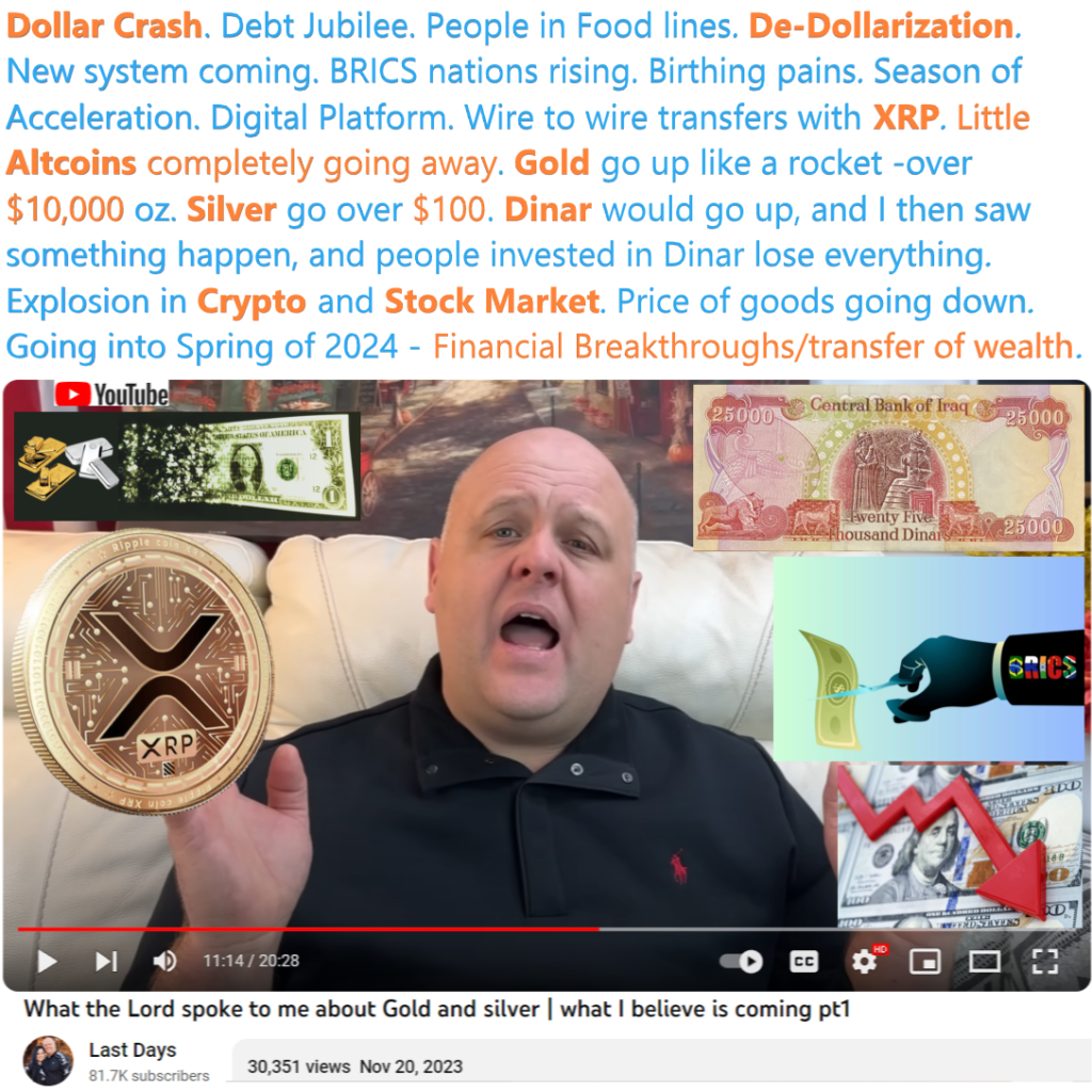 Dollar Crash. Debt Jubilee. People in Food lines. Total de-Dollarization. Total new system is coming. BRICS nations rising. We are going through the birthing pains. We’re in a season of acceleration. Digital Platform. Wire to wire transfers with XRP. Other little altcoins completely going away – like they didn’t exist. I saw Gold go up like a rocket -over $10,000 an ounce. I saw Silver going well over $100. Dinar would go up, and I then saw something happen, and people invested in Dinar lose everything. I saw an explosion in crypto and stock market. I saw explosion in price of goods going down. I saw, going into Spring of 2024 – financial breakthroughs for people – transfer of wealth.