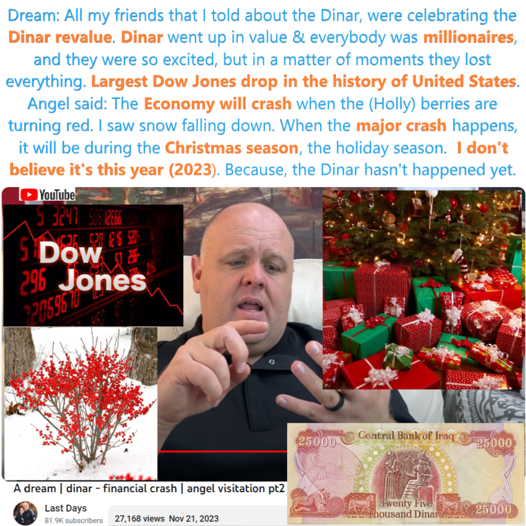 Brandon said, “The Economy will crash when the (holly) berries are turning red. I saw snow falling down. Angel told me, look at the snow. Then I went inside, and all my friends that I told about the Dinar, were celebrating Dinar – the Dinar revalue / reinstatement to where it was.”