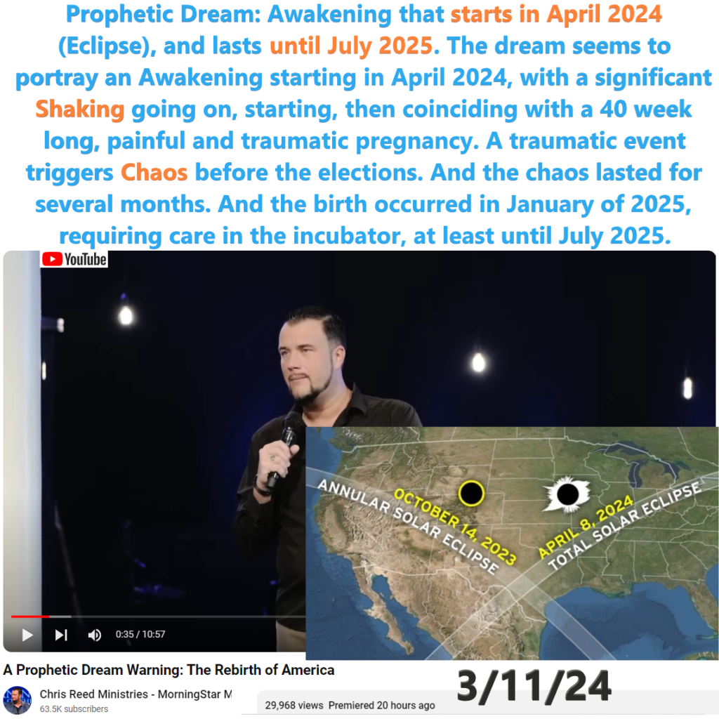 Awakening that starts in April 2024 (Eclipse), and lasts until July 2025. The dream seems to portray an Awakening starting in April 2024, with a significant shaking going on, starting, then coinciding with a 40 week long, painful and traumatic pregnancy. A traumatic event triggers chaos before the elections. And the chaos lasted for several months. And the birth occurred in January of 2025, requiring care in the incubator, at least until July.