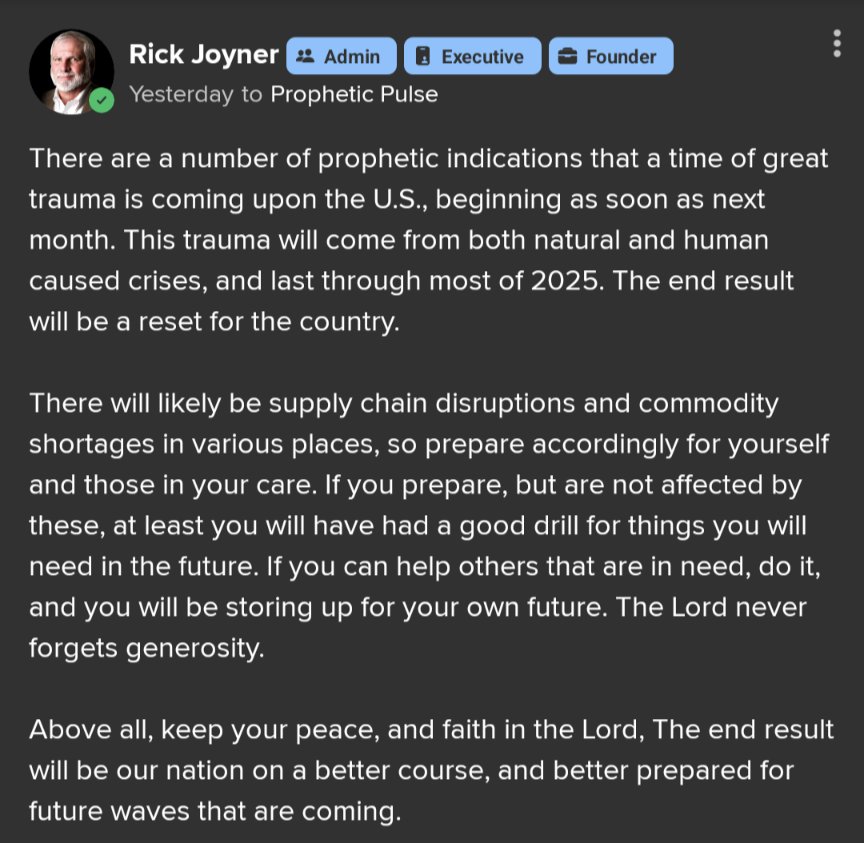 There are a number of prophetic indications that a time of great trauma is coming upon the U.S., beginning as soon as next month. This trauma will come from both natural and human caused crises, and last through most of 2025. The end result will be a reset for the country.