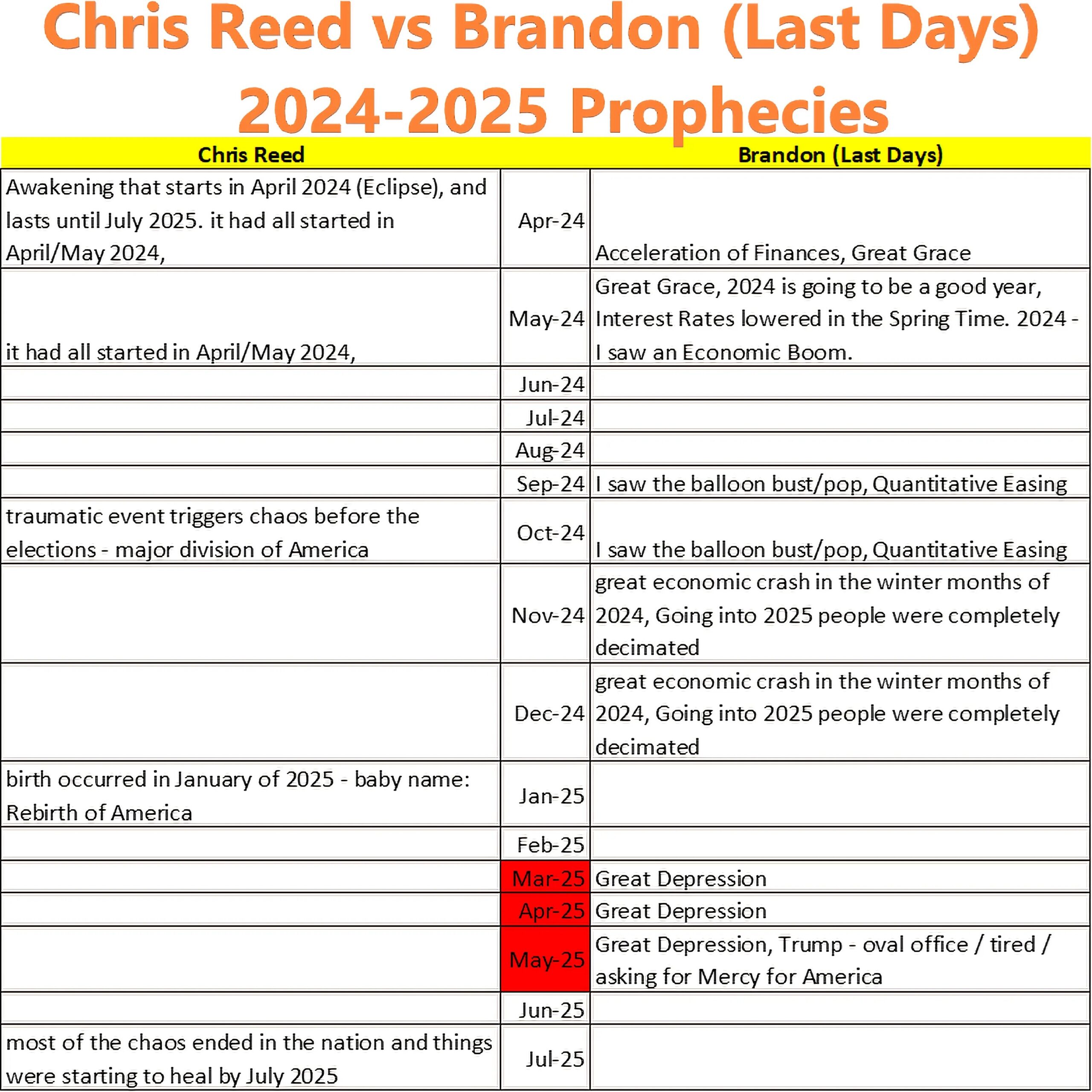 Here is a comparison of Chris Reed’s vs Brandon Biggs’s (Last Days) prophecies for 2024 – 2025. Click on the community post links below to see the full prophecy.