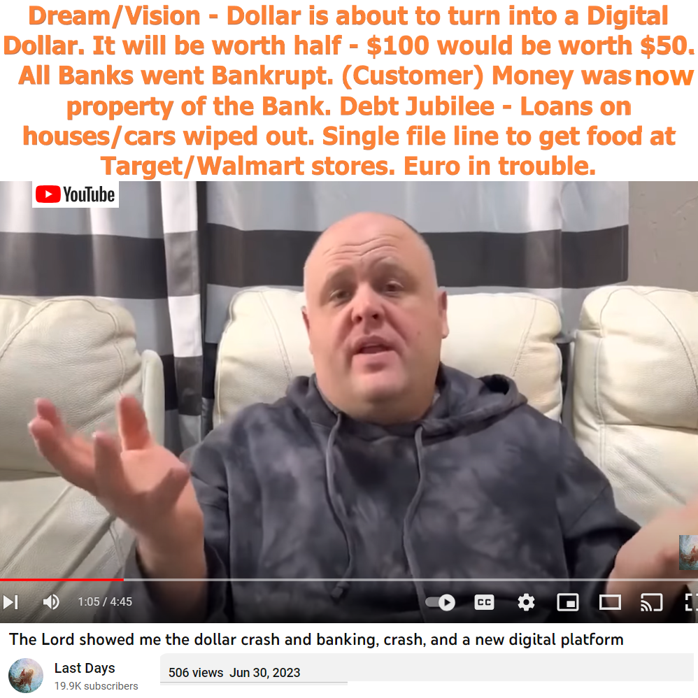 The Dollar’s about to turn into a Digital Dollar. It will be worth half – $100 would be worth $50. All Banks went Bankrupt. (Customer) Money was now property of the Bank. Debt Jubilee – Loans on houses/cars wiped out. Single file line to get food at Target/Walmart stores. Euro in trouble.