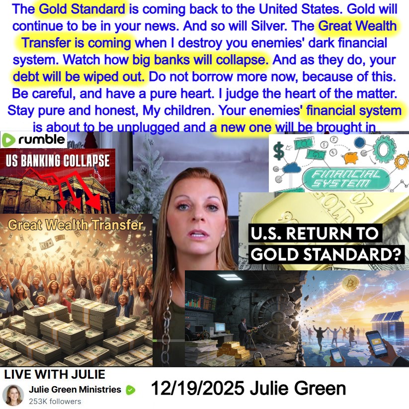 Great Wealth Transfer is coming when I destroy you enemies’ dark financial system. Prophecy by Julie Green on 12/19/25. See partial transcript, AI Summary, and video link below: