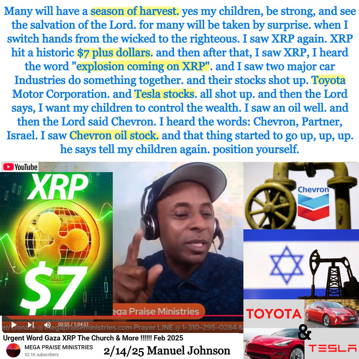 $7 XRP. Explosion coming on XRP. Tesla, Toyota, Chevron Oil. Prophecy by Manuel Johnson on 2/14/25. See my summary, partial transcript, and video link below: