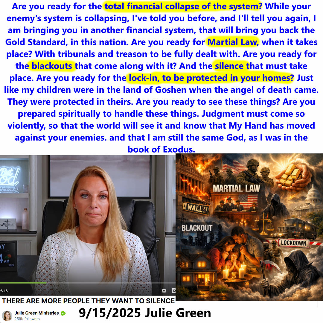 Are you ready? – Financial System collapse, Martial Law, Blackouts, Lock-in. Prophecy by Julie Green on 9/15/25. See partial transcript and video link below: