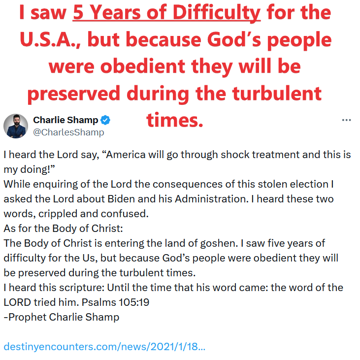 I heard the Lord say, “America will go through shock treatment and this is my doing!” I saw five years of difficulty for the U.S.A., but because God’s people were obedient they will be preserved during the turbulent times. Prophet Charlie Shamp 3-31-24