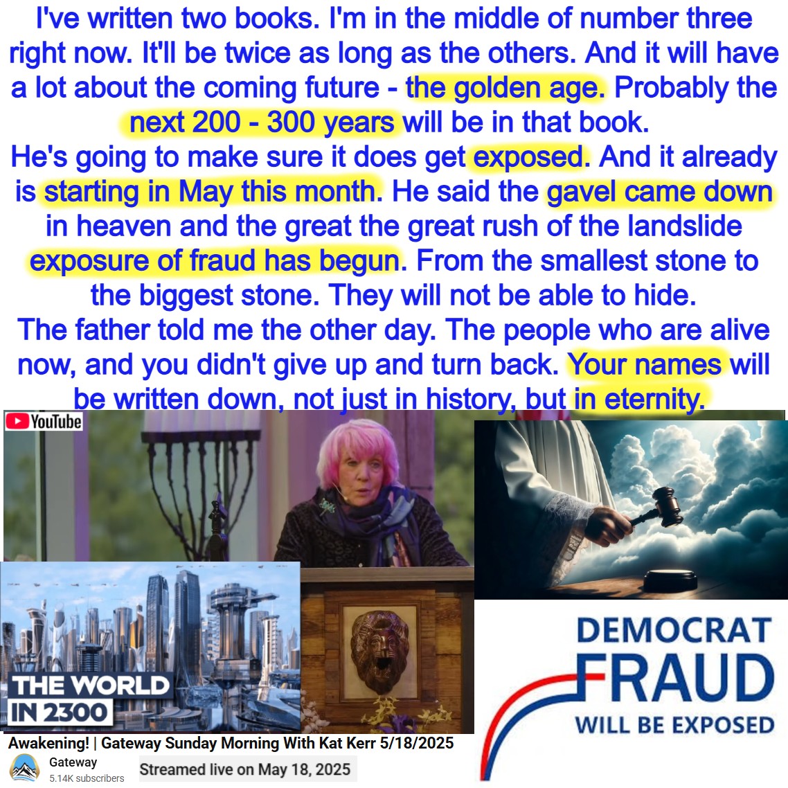 Exposures starting in May (2025). The gavel came down in Heaven and the exposure of Fraud has begun. Prophecy by Kat Kerr on 5/18/25. See partial transcript and video link below: