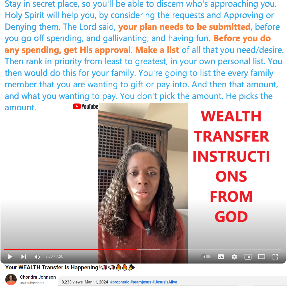 Get Approval from God before spending Wealth Transfer money prophetic word. I have not watched this channel before, so can’t comment as to the legitimacy of the prophetic word and whether or not it’s from God. But even if we just take it as common sense instruction, it does make sense. As always, according to 1 John 4, please use Discernment and Test the Spirits. See partial transcript and video link below.